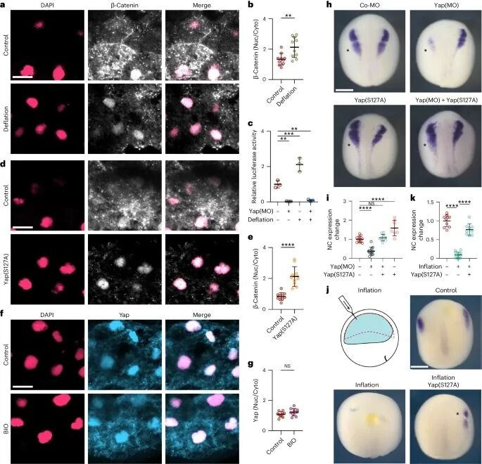 實驗方法:研究使用了多種實驗方法,包括在不同發(fā)育階段的胚胎中操縱靜水壓力、分析神經嵴標記物的表達、使用Wnt信號傳感器、以及通過Yap形態(tài)抑制和激活實驗來研究其在神經嵴形成中的作用。